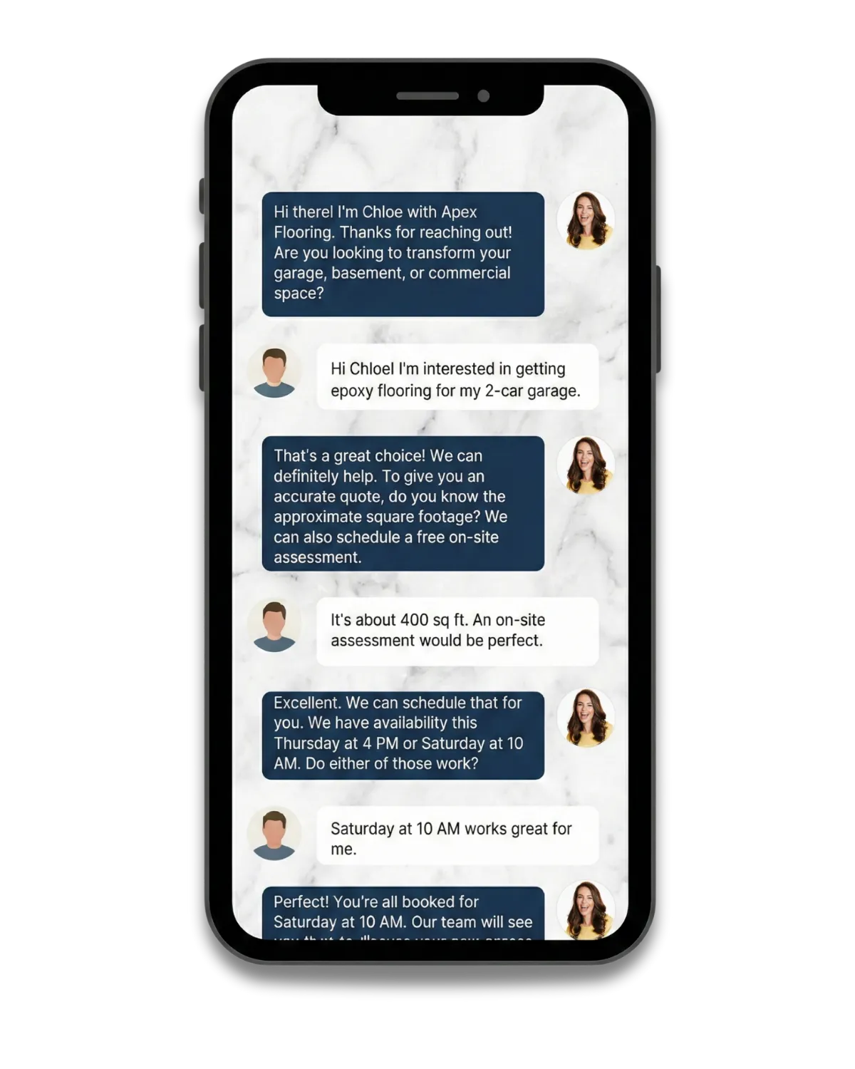 Epoxy Floor Assistant™ makes sure that never happens again. It replies to every inquiry in seconds, keeps the conversation going, and books On-Site Coating Estimates for you automatically.
