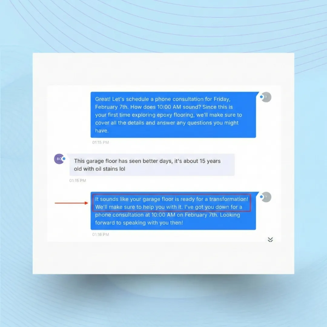 Look at this conversation. That’s not a person, that’s Epoxy Floor Assistant™ casually guiding a lead toward booking a call.